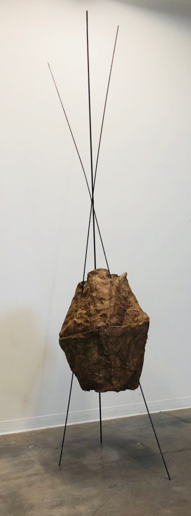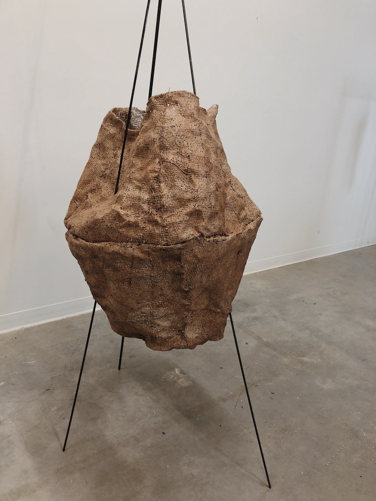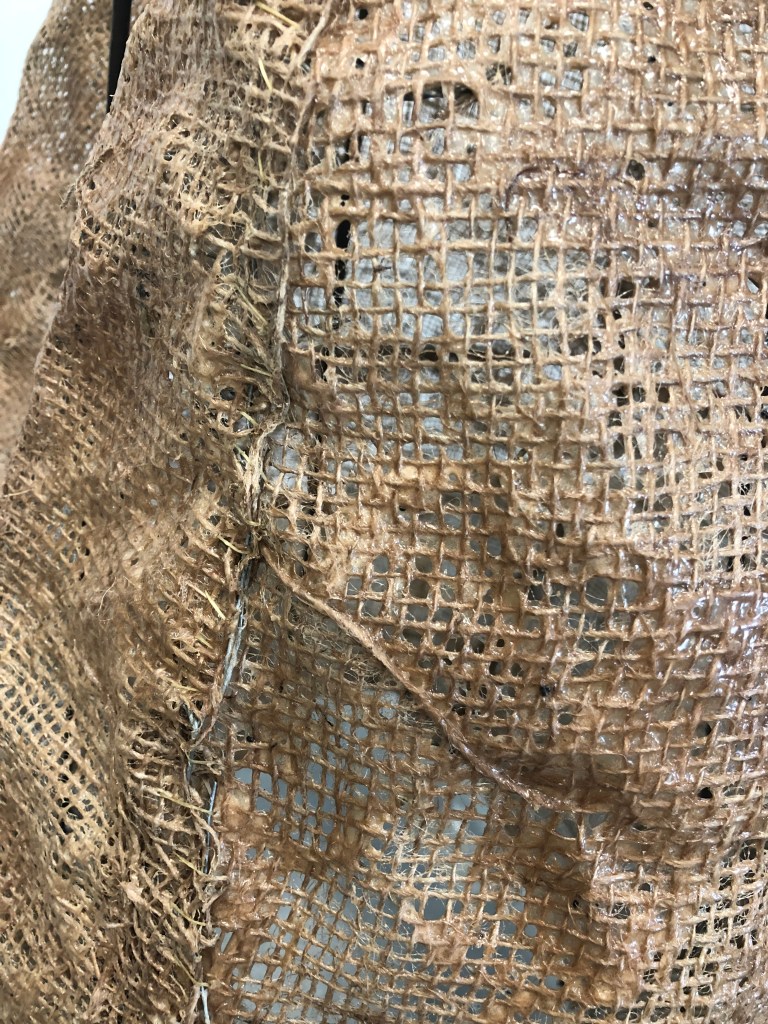 Metal, chicken wire, burlap, latex.